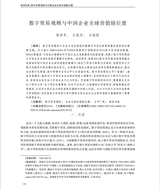 侯俊军教授、王胤丹博士以及王振国博士后合作撰写的学术论文《数字贸易规则与中国企业全球价值链位置》在《中国工业经济》2023年第4期刊出。《中国工业经济》期刊由中国社会科百家乐官方网站