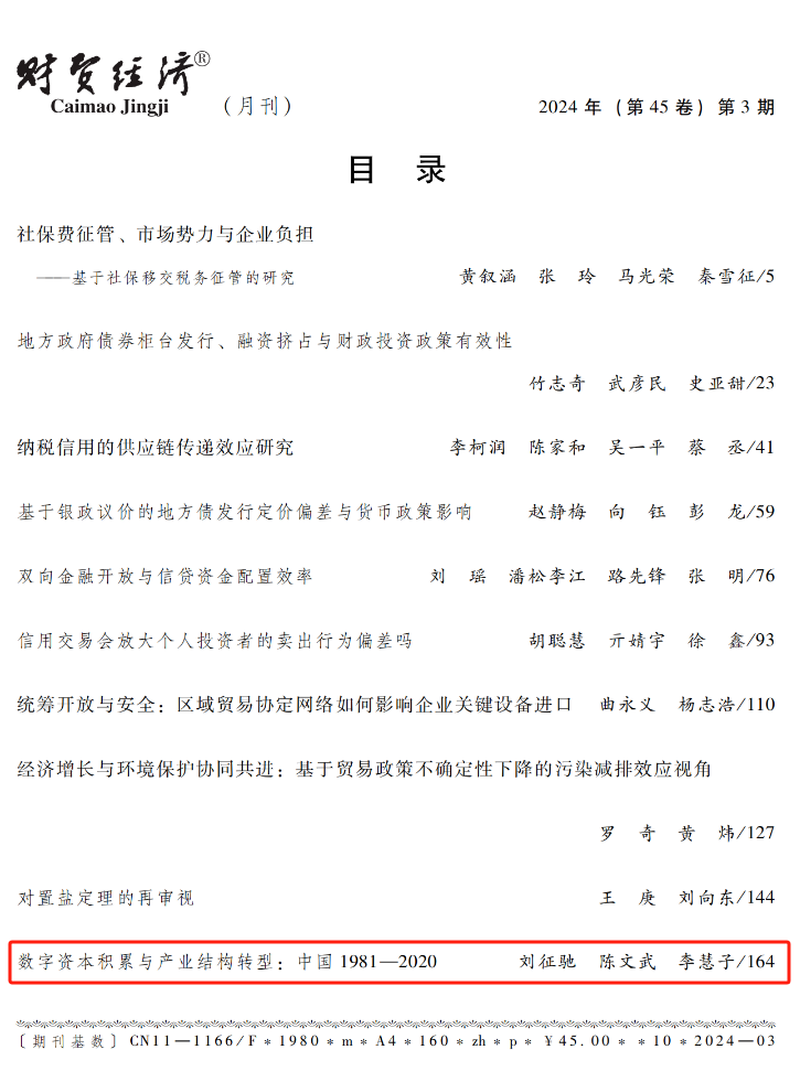 刘征驰教授、陈文武、李慧子博士合作撰写的学术论文《数字资本积累与产业结构转型:中国1981-2020》在《财贸经济》2024年第3期刊出。《财贸经济》期刊是是中国社会科百家乐官方网站