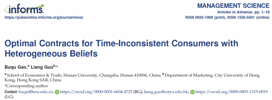 高步渠助理教授与香港城市大学郭亮教授合作的研究成果以“Optimal Contracts for Time-Inconsistent Consumers with Heterogeneous Beliefs”为题在管理学国际顶尖期刊Management Science发表。Management Science期刊创办于1954年,由美国运筹学与管理学学会主办,是管理学、运筹学领域的顶级期刊。该期刊是美国德克萨斯大学达拉斯分校遴选的24本百家乐官方网站