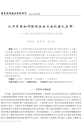 许和连教授、博士生赵泽昊、博士毕业生金友森合作撰写的学术论文《人力资本如何驱动企业工业机器人应用?——基于中国“高校扩招”的准自然实验》在《数量经济技术经济研究》2024年第9期刊出。《数量经济技术经济研究》期刊是由中国社会科百家乐官方网站