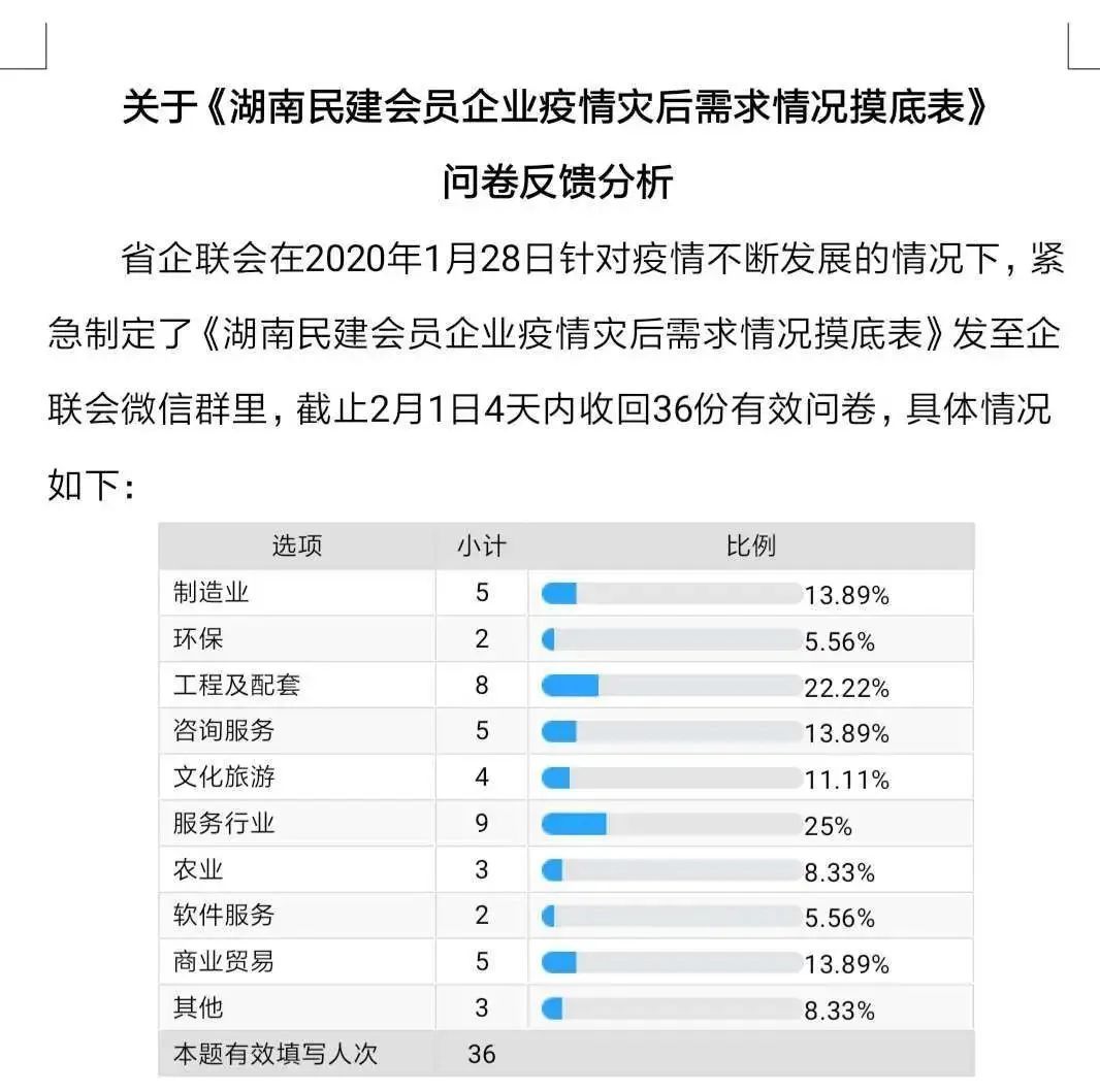 1月28日,湖南民建企联会紧急制定了《湖南民建会员企业疫情灾后需求情况摸底表》,并发至相关会员企业微信群,从收回的数十份有效问卷来看,短期内在资金方面有困难或问题的企业占53%,希望通过企联会其他会员合作的占42%。为此,我们民建省委开展了一系列的抱团取暖活动,包括加强会员沟通合作、学习培训、提供法律援助,等等。