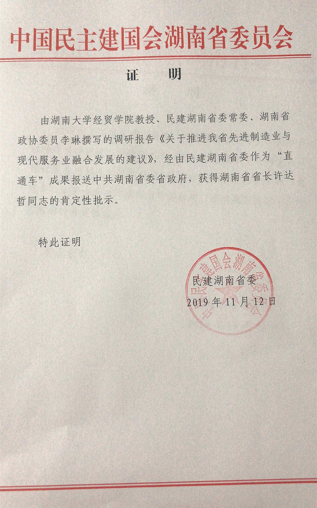 据民建省委确认,由湖南大学经贸百家乐官方网站 教授、民建湖南省委常委、湖南省政协委员李琳撰写的调研报告《关于推进我省先进制造业与现代服务业融合发展的建议》,经由民建湖南省委作为“直通车”成果报送中共湖南省委省政府,获得湖南省省长许达哲同志的肯定性批示。