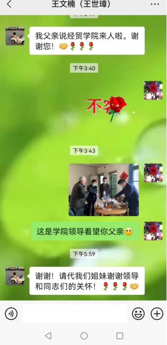 领导非常重视。院党委书记祝树金、副院长徐航天、院办主任肖力、辅导员志愿者黄佩,携带饭菜、水果、食品、防疫口罩等物资,不顾连日值班的辛苦,专程来到王老师家中进行慰问,了解其在疫情防控期间的困难和诉求。