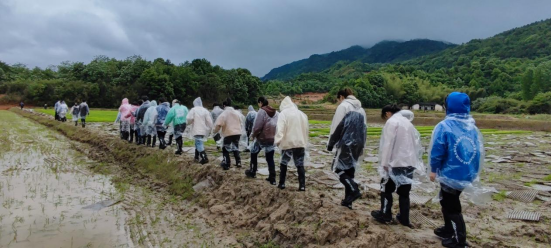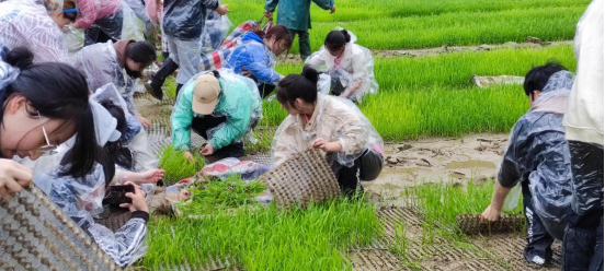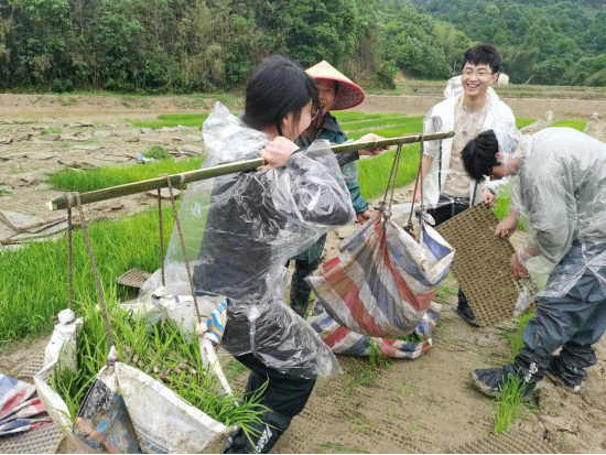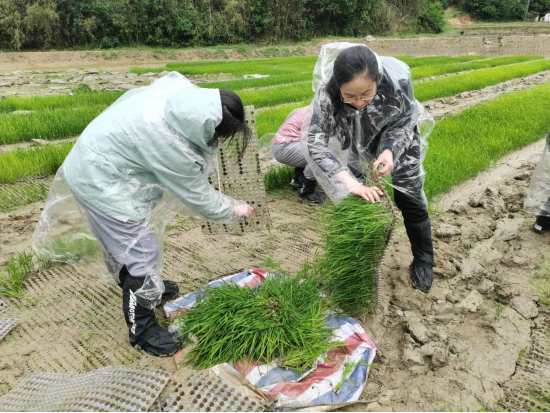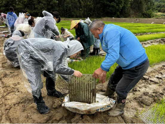 师生深入田间地头,实际体验春耕。当地村民为同学们详细介绍了再生稻的优势,分享了育秧、插秧、田间管理、成熟的过程,演示了插秧基本动作,在村民的指引下,师生协作分组作业,共同完成了分苗、运苗、抛秧的春季耕种全流程。