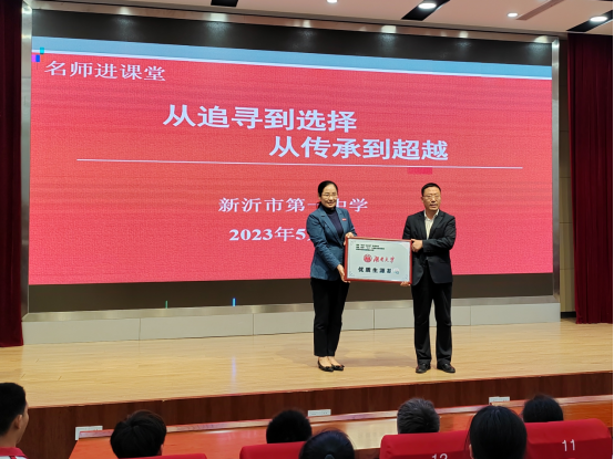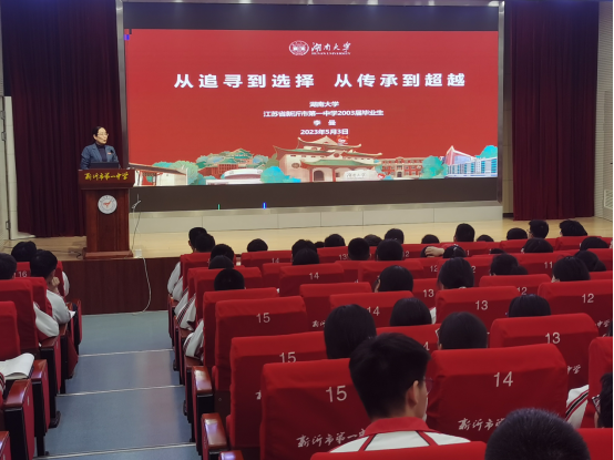 向新沂市第一中学授予湖南大学"优质生源基地",并以“从追寻到选择,从传承到超越”为主题与学弟学妹们进行了交流,详细介绍和展示了湖南大百家乐官方网站