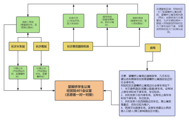 (2)迎新期间财院校区大门至望麓桥公寓全路段、望麓桥公寓至枫林路(两处)全路段进行交通管控;允许车辆经枫林一路驶入财院路至财院校区大门停车临时下客,车辆自财院校区大门处掉头返回。为避免拥堵,各位新生提前规划行进路线,步行进入园区。