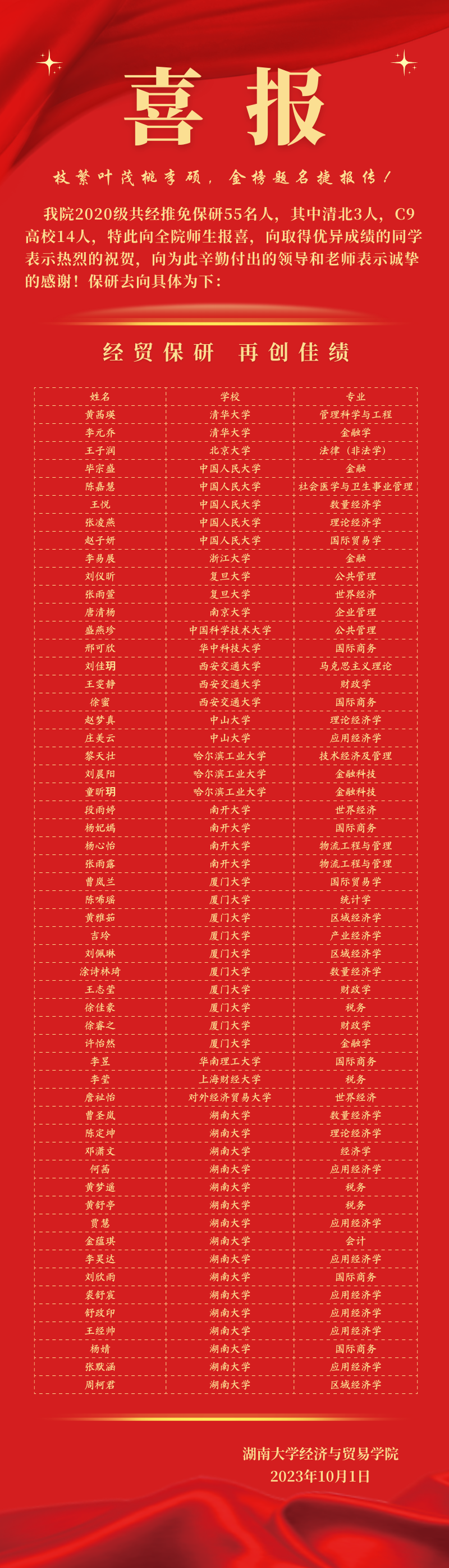 百家乐官方网站 2020级共经推免保研55人,其中清北3人,C9高校14人,特此向全院师生报喜,向取得优异成绩的同学表示热烈的祝贺,向为此辛勤付出的领导和老师表示诚挚的感谢!