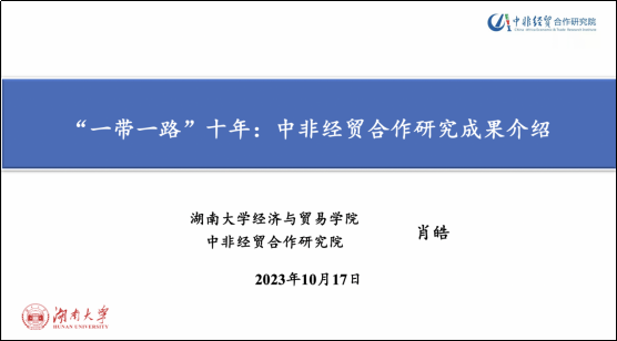 2023年10月17日,第三届“一带一路”国际合作高峰论坛召开之际,“‘一带一路’10年:中非经贸合作回顾与展望”研讨会在对外经济贸易大学召开,会议由中国世界贸易组织研究会与中非经贸合作研究院联合举办 。
