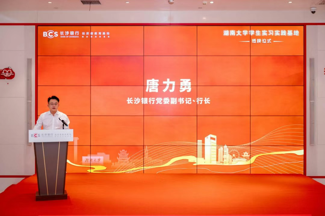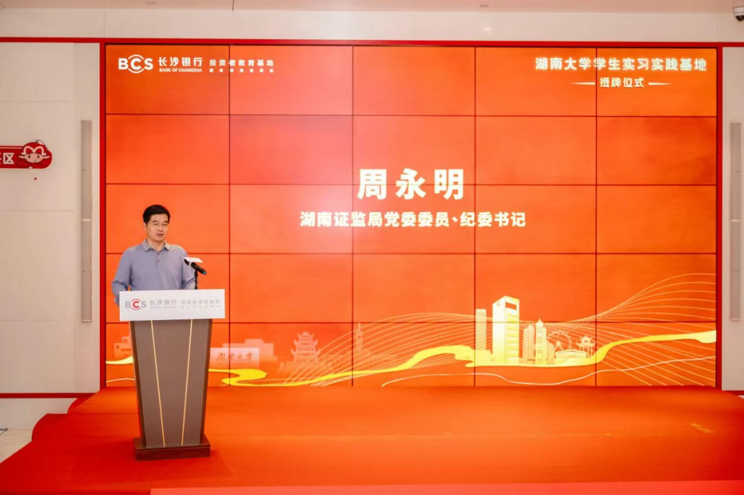 湖南证监局党委委员、纪委书记周永明表示,湖南证监局一直积极落实党中央、国务院部署和证监会工作要求,高度重视投资者教育工作,逐步形成具有湖湘特色的投教工作名片。感谢湖南大学和长沙银行对辖区投资者教育工作的积极投身,期待“湖南大学学生实习实践基地”未来充分发挥投资者教育与高校人才战略的纽带功能,成为辖区投教事业发展的一面旗帜。