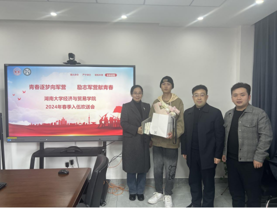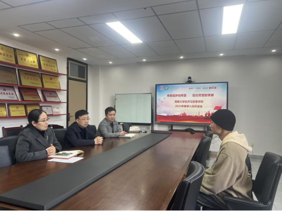 党委书记祝树金向谢宽同学参军入伍表示热烈祝贺,对其积极投身国防事业和军队现代化建设的行为给予了充分肯定,并希望他严格遵守军规铁纪,努力学习军事技能,苦练胜战本领,争做有灵魂、有本事、有血性、有品德的“四有”新时代革命军人;并将湖南大学“实事求是,敢为人先”的精神带到部队中,加强政治学习和专业学习,提升自身综合素养,以拼搏奋进书写人生精彩华章。