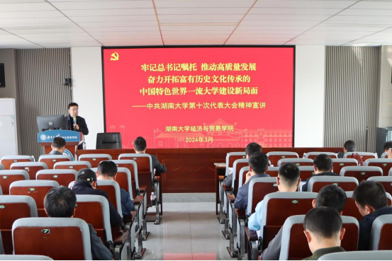 党委书记祝树金在全院大会宣讲中国共产党湖南大学第十次代表大会精神,全体教职工参加学习。