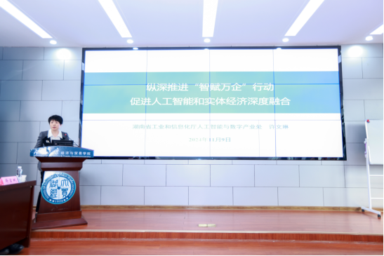 湖南省社科院区域经济与绿色发展研究所副所长、研究员、湖南民建研究院特聘研究员刘敏以“湖南推动人工智能与实体经济融合发展的对策研究” 为题作主旨演讲。从湖南推动人工智能与实体经济融合发展的基本现状、现实难题、对策建议等方面进行主旨演讲。