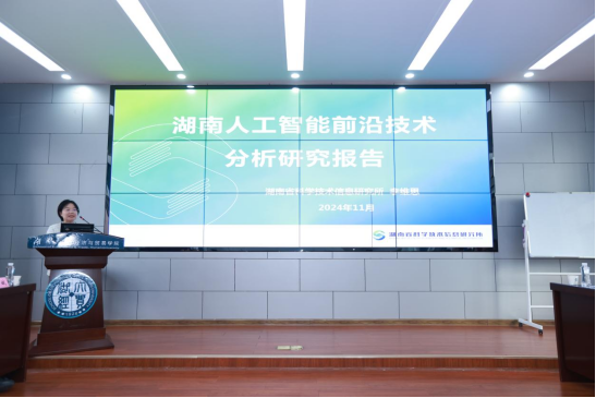 省科技厅信息研究所副所长李维思以“湖南人工智能前沿技术分析研究报告” 为题作主旨演讲。从发展形势——AI引领全球新变革、发展基础——AI潮涌三湘风正劲、发展困境——AI破浪前行待有时、发展建议——AI智算万物向未来四个方面进行分享。