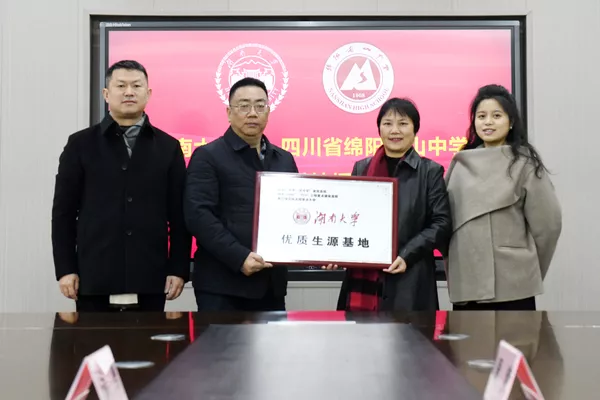 教师代表湖南大学前往绵阳南山中学开展座谈会,并进行“优质生源基地”授牌仪式。