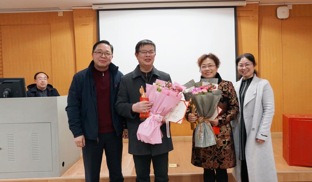 院长许和连教授手中接受了证书、奖杯及奖金!申慧敏老师作为曾经的获奖人为二位老师献花。大家用热烈的掌声为他们的兢兢业业的工作表示了由衷的祝贺。