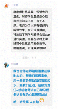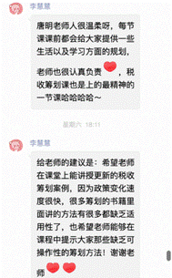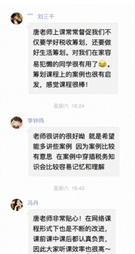 “唐老师人很温柔,每次课前都会给大家提供一些生活以及学习方面的规划。老师也很认真负责,税收策划课也是上的最精神的一节课。”“税收策划课很实用,里面教导的知识以后都能用到。老师也很温柔耐心,给我们学习、生活的建议,非常喜欢!”