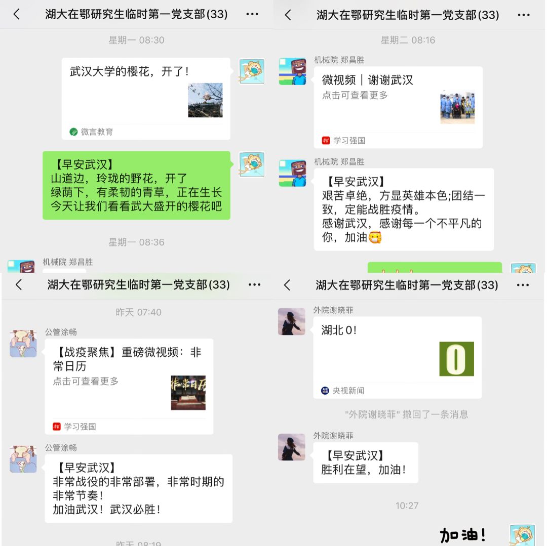 临时第一党支部的党员们及对接的群众们身处疫情的中心武汉,他们直面了疫情的来势汹汹,也被焦虑、急切等复杂情绪包裹着。为了让身处武汉的研究生们多一份安心和温暖,临时第一党支部委员会提出“早安武汉”计划。“早安武汉”计划以支部委员轮流值日的方式,搜集正能量的权威文章、视频等,每日早晨值日委员在支部群和武汉研究生群中分享,抚平在同学们心中的疲惫,装满能量和期待。