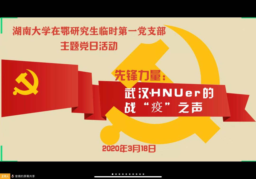 在鄂临时第一党支部的党员和在武汉的研究生们在这场战“疫”中扮演着不同的角色,发挥着先锋力量,发出了铿锵有力的属于武汉HNUer的战“疫”之声。春天已经来临,期待相约麓山,武汉加油,中国加油!