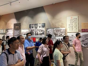 进入展厅,一幅幅壮烈的革命历史画面,一个个革命将士的名字,随着讲解员娓娓道来,一一在我们眼前重现。毛泽东同志当年在中国革命最艰难的时期,领导湘赣边界的秋收起义,一手创立了工农革命军第一军第一师,当时这支部队一共只有4000余人。因为当时套用苏联的革命经验——走城市包围农村的斗争路线,毛泽东带领队伍攻打大城市长沙,但是因为敌我差距巨大,部队损失惨重,几度受挫后,革命队伍退到文家市。根据敌强我弱的形势,毛泽东主持召开前敌委员会会议,改变了攻打长沙的计划,决定保存实力,向敌人统治力量薄弱的农村中去坚持武装斗争,发展革命力量,提出了走“农村包围城市”的道路。随后,部队向井冈山进发,行军途中,因遭遇敌人伏击,总指挥卢德铭牺牲。1927年9月29日,毛泽东发现部队军心涣散,在部队到达江西省永新县的三湾村时进行了著名的三湾改编,把党的支部建在连上,铸就了人民军队的灵魂——永远听从党的指挥。改编完成后,起义部队抵达井冈山茨坪,将工农革命军的旗帜插上了井冈山。从此,开始了创建井冈山革命根据地的伟大斗争。秋收起义是中国革命的伟大历史转折点,首次在武装斗争中公开打出中国共产党的旗帜,进一步表明了中国共产党独立领导革命战争的决心,创造了我党我军历史上的“三个第一”,即组建了我党第一支工农革命军队;诞生了我党我军第一面军旗;打响了秋收起义第一枪。随着参观的深入,老师们仿佛看到了秋收起义炮火纷飞的壮烈场面,怀着对革命先烈由衷敬仰的缅怀之情,我们深刻体会到了革命历程的艰难曲折和幸福生活的来之不易。