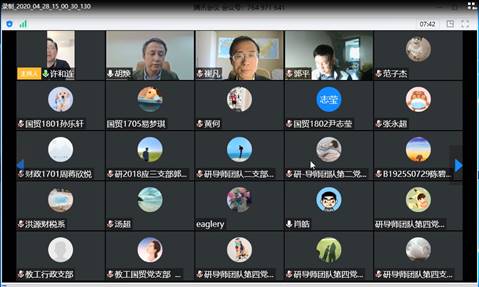 党委书记郭平教授做总结发言,他认为当前在全球经济受疫情极大冲击的背景下讨论新冠疫情对外贸的影响具有重要的理论和现实意义,希望广大教工党员和学生党员要积极消化吸收专家和企业家们的真知灼见,转化为实际行动,为国家抗疫做出自己的贡献。同时表示,这样的活动,既是很好的主题党日活动,也是很好的学术交流与碰撞,同时在特殊时期以灵活多样的方式开展通支部主题党日活动,通过线上交流,效率更高,参与范围更大,可以在今后的党建活动中进一步进行探索和推广。