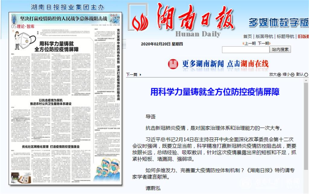 院士、湖南省院士咨询与交流促进会会长谭蔚泓教授作为《湖南日报》特约请专家学者提出《用科学力量铸就全方位防控疫情屏障》:一是保持信息公开,二是加强疫情演练,三是保障科研供给,四是注重基础科研与临床实践相结合,五是改革医疗领域人才培养模式。