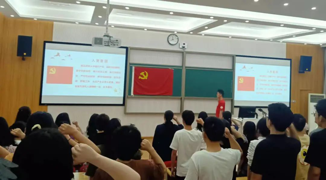 学生党员代表王子方带领新发展党员进行入党宣誓、毕业生党员重温入党誓词。铮铮誓言在空气中久久回荡,坚定了同学们为共产主义事业奋斗终身的理想信念,激励着全体党员担当时代责任,不忘初心跟党走,牢记使命再出发。