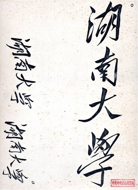 其一,请毛主席题写校名。李达为湖大留下的最宝贵的有形资产,应该要算他请毛主席亲笔题写的“湖南大学”校名了。全国内许多高校校名都用的是毛体字,但大多都是从主席的手迹中拼装组合而成,只有湖大等为数不多的几所高校享有主席亲笔题写校名的殊荣。关于这段史实,当时的亲历者李传秾校友曾回忆:作为新中国成立后湖大的第一届学生会主席,他曾大胆地向李达校长提议将湖南大学改名为毛泽东大学,并以国立湖南大学学生会的名义将建议写入一封未封口的信里。李达在一次与毛主席吃饭时将这封信交给了主席。毛主席看了后,笑着说:“坚决执行党的决议,不得以领导人的名字命名。”“那能给湖南大学题个校名吗?”李达问。主席爽快地答应了。1950年8月20日,毛主席致函李达,题写了三个校名供湖大选择。1951年1月1日,百家乐官方网站