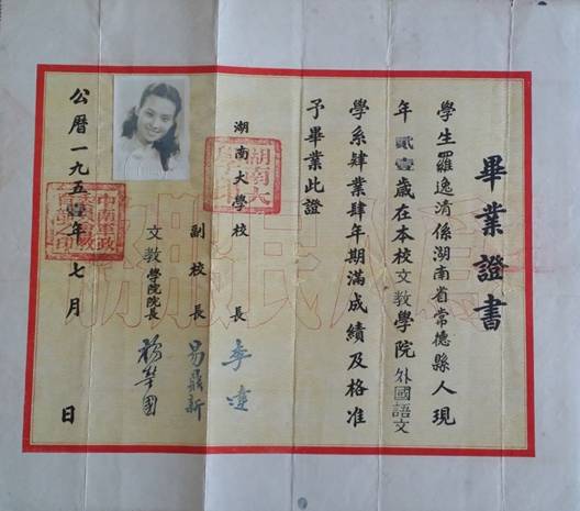 图8:李达校长签发的湖南大学毕业证书(1951届外语系罗逸清)