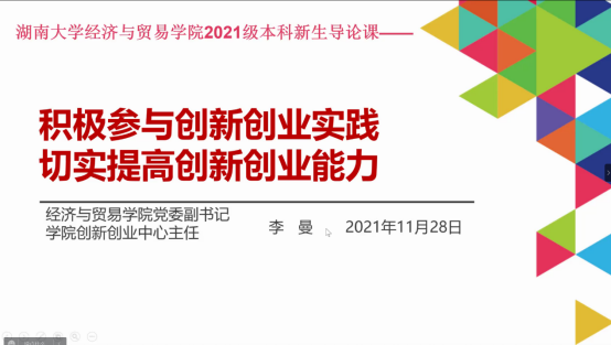 为推动2021级的新生们积极参与创新创业实践,切实提高同学们创新创业的能力,经贸院特此为我们邀请了李曼书记与胡煊赫辅导员进行了一次双创系列讲座。通过此次讲座,我真切地感受到了湖南大学对创新创业能力的重视与培养,完善的平台与载体搭建,专业的团队建设等等,都让我体会到了百家乐官方网站