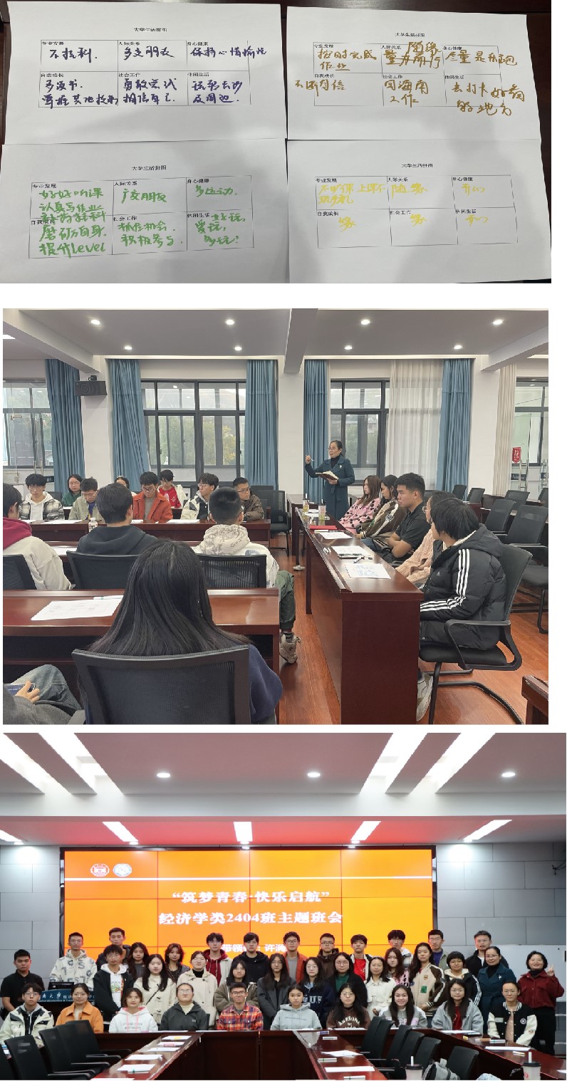 经济类2404班“筑梦青春”主题班会在财院校区行政楼201教室举行。湖南大学党委副书记李曼老师,辅导员蔡婕萍老师与班主任陈永昌老师莅临班会现场 ,就“认识自我”围绕同学们的学习生活、生涯规划、未来发展等与同学们进行深入探讨,并殷切寄语。