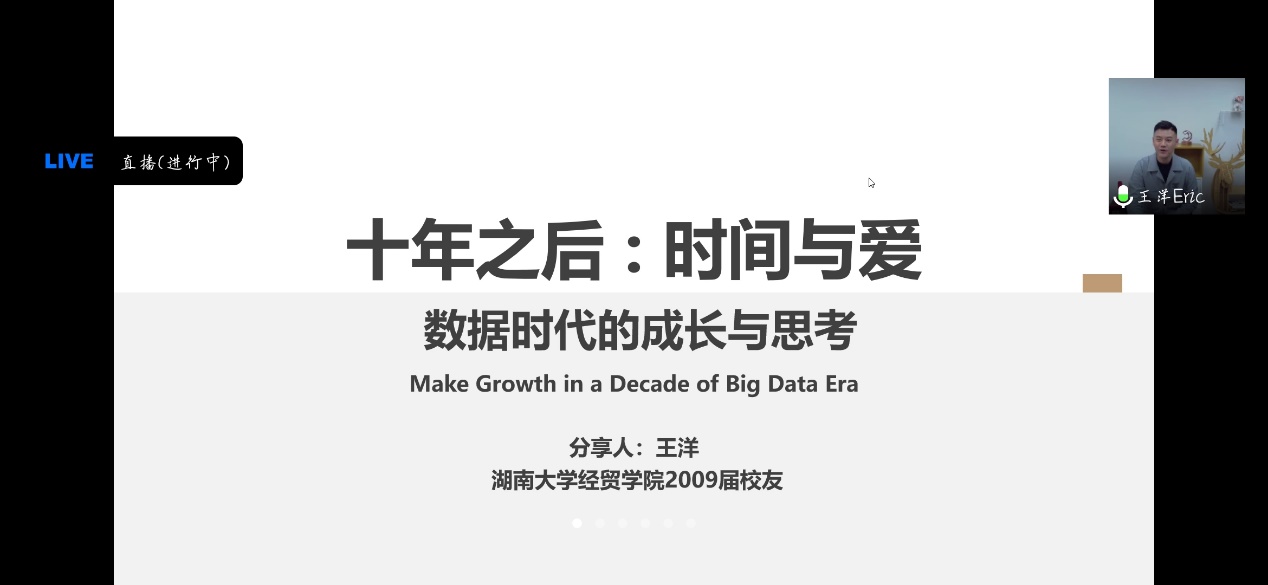 恰同学少年,风华正茂。十年后的今天王洋与在校同学们在云端畅谈相聚,怀揣的依旧是对湖大、对经贸的深深留恋之情和感恩之心。在此,我们衷心祝愿各位校友们事业顺利,幸福安康,欢迎校友们重回母校,忆往昔湖大情!