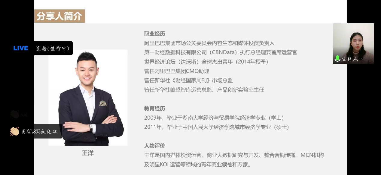 王洋学长2009年毕业于湖南大学经济学专业,在校期间曾任学生会主席、院刊创刊总监、年级长,多次获得国家奖学金、省优秀毕业生,SIT挑战杯一等奖等多项荣誉,毕业时保送至中国人民大学攻读硕士。曾任新华社《财经国家周刊》市场总监,新华社瞭望智库运营总监、产品创新实验室主任,阿里巴巴集团CMO助理,目前供职于阿里巴巴集团市场公关委员会内容生态和媒体负责人,同时兼任第一财经科技有限公司(CBNData)执行总经理兼首席运营官。因其在传媒领域与财经领域的交叉贡献,2014年被世界经济论坛达沃斯授予“全球杰出青年”称号。
