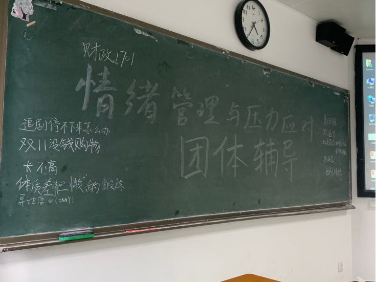 活动一开始,先分组进行了热身小游戏。紧接着,在心理委员向乐仪的组织下,同学们以小组为单位在黑板上写下了困扰自己却得不到解答的的相关心理问题。全班同学针对这些细致而微的问题进行了热烈的讨论。当中不乏有些问题是同学们共同面临的,许多同学积极提出了自己的建议和意见,活动的气氛达到了高潮。
