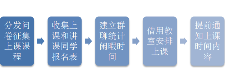 学风。首先为了加强上课效果,我们首先通过问卷统计同学们对各课程难度的见解并收集各班听课报名情况,根据报名的人数和收集到的问卷决定开设哪门课程,这样大大提高了上课效率。统计了信息后,我们了解到同学们普遍认为全英文课程《国际经济学》以及往年挂科率极高的《税收学》需要开课。接着我们建立群聊,收集听课同学和小老师的空闲时间以便安排上课。不过因为同学们在不同的时段都有事,因此我们再次发布群投票,遵从少数服从多数的原则,选取了听课人数最多的时段。由于本学期开课数目较少,而且课程难度较大、上课内容比较多,每节课的时间相较于上个学期都增加了二十分钟。上课时间是每周周二、周三的19:30到20:00。通过教务系统,我们长期借用了水教307教室比上学期每周借一次教室方便了好多。最后在开课前天晚上,我们具体通知了每一位同学也通过各班学委将上课内容和地点发送到各班班群,让没有报名但对部分课程内容不够了解的同学可以补缺补漏。