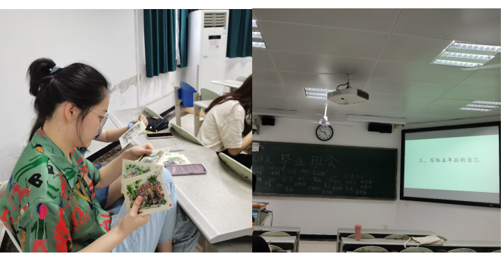 第三部分为写给五年后的自己。同学们在明信片上写下想对五年后的自己说的话,由班长温鹏同学收齐保管,而五年后是湖南大学的百年校庆,大家约定在五年后再次在湖大相聚,领取这张“写给五年后自己”的明信片。