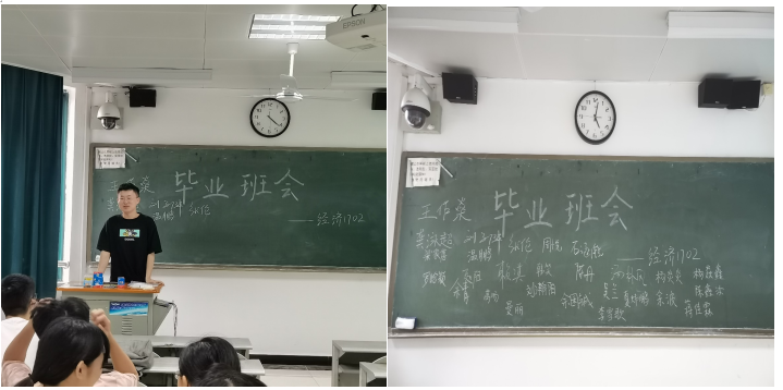 经济1702班的班会比较有特色,班会第一部分为“你好,老同学”。刚入学时的第一次班会,大家作了自我介绍,最后一次班会同学们再次介绍了自己,不同的是,同学们在台上更多的是感谢各自四年的陪伴,介绍了各自的毕业去向,并期待未来与同学们在不同城市相遇。