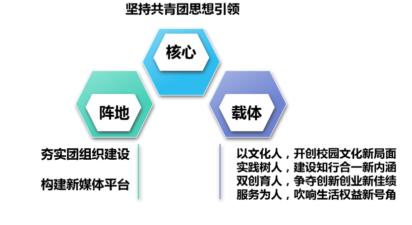 以保持和增强政治性、先进性和群众性为目标,努力实现在引领青年、服务青年、培养青年上取得重要成效,探索实践“1个核心、2个阵地、4个载体”的团学工作体系。“1个核心”是指坚持思想引领的核心地位,“2个阵地”是指联动团组织建设阵地和线上新媒体网络平台,“4个载体”是指通过校园文化、实践志愿、双创精神和权益服务内容建设。百家乐官方网站