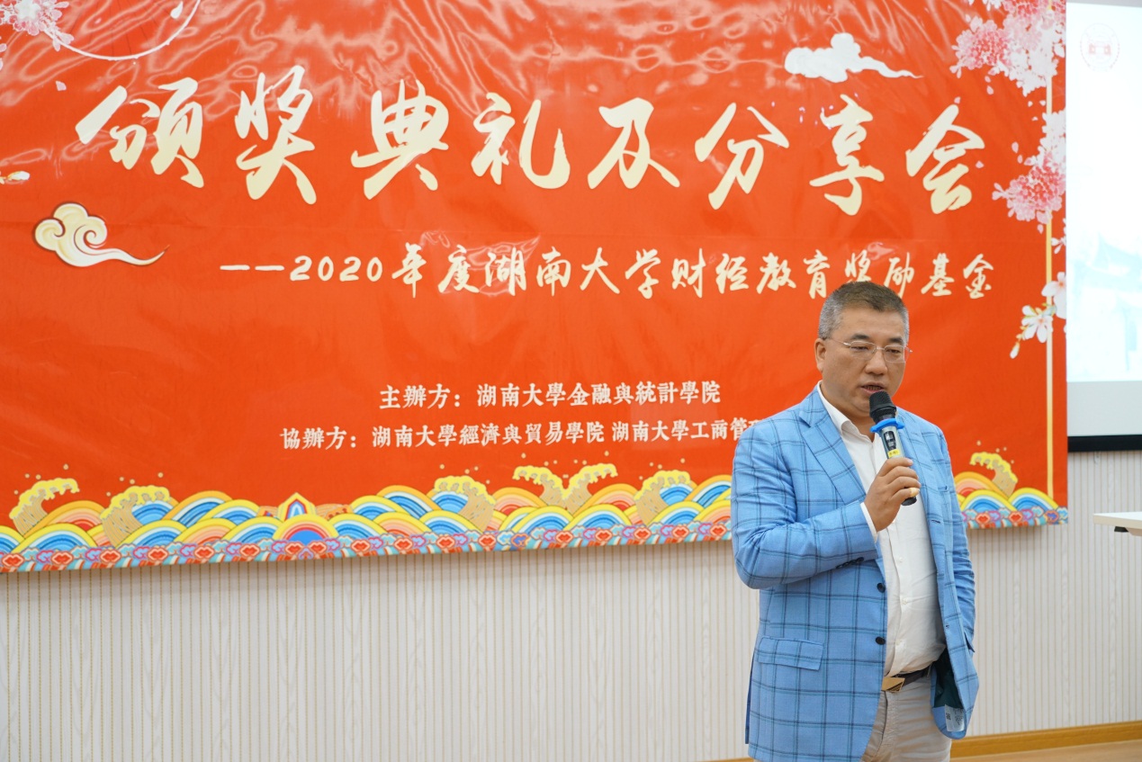 李劲松宣读获奖名单。老教师苏醒教授和吴献金教授荣获“恩师奖”;青年教师马勇、李曼荣获“优秀青年教师奖”;15名学生获得“湖南大学卓越研究生.新生奖学金”荣誉称号,11名学生获得“优秀学生干部奖”,11名学生获得“优秀研究生奖”,20名学生获得“优秀本科生奖”。